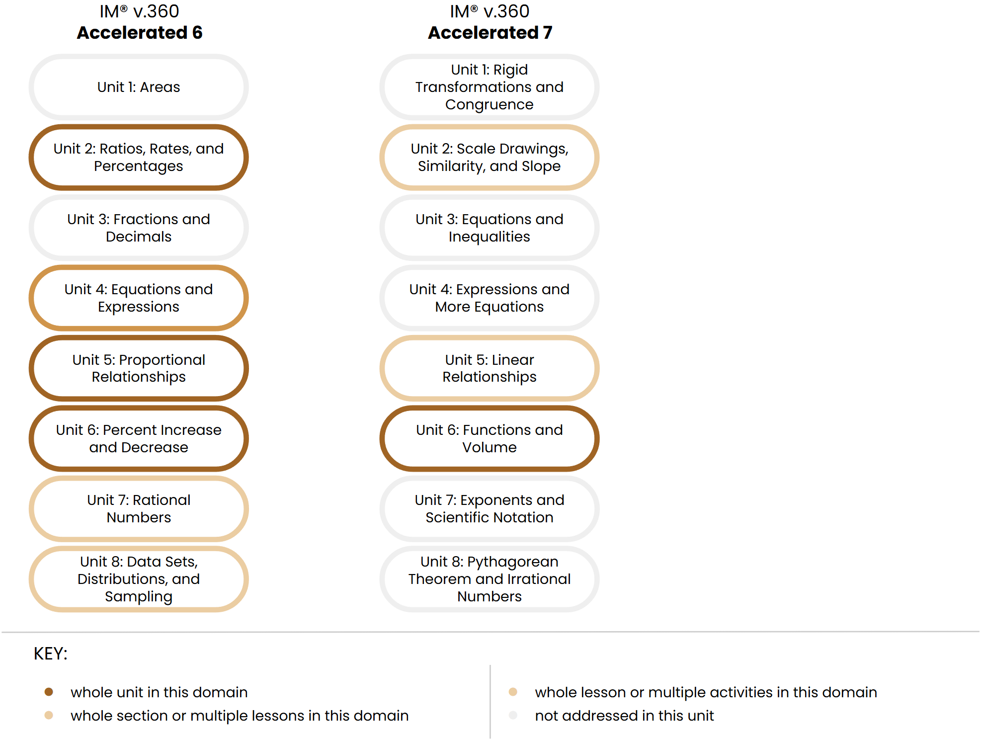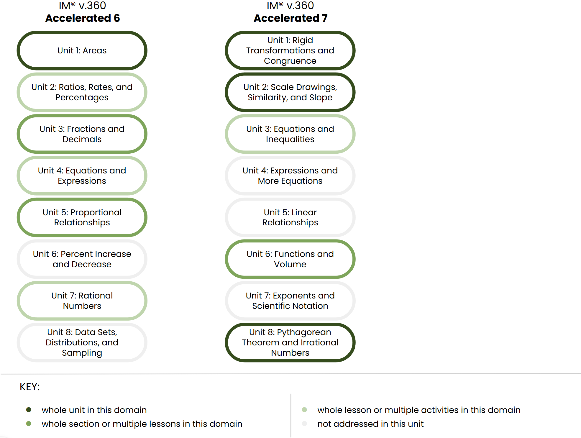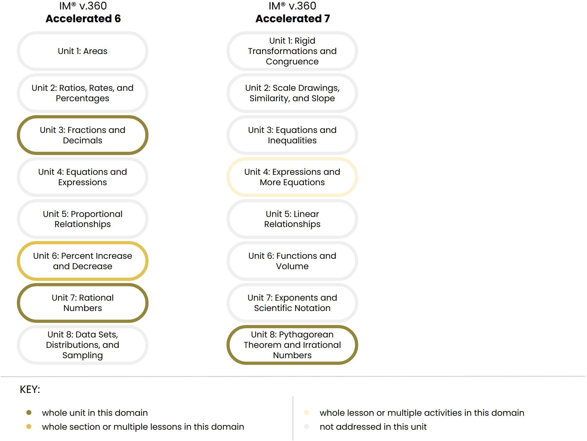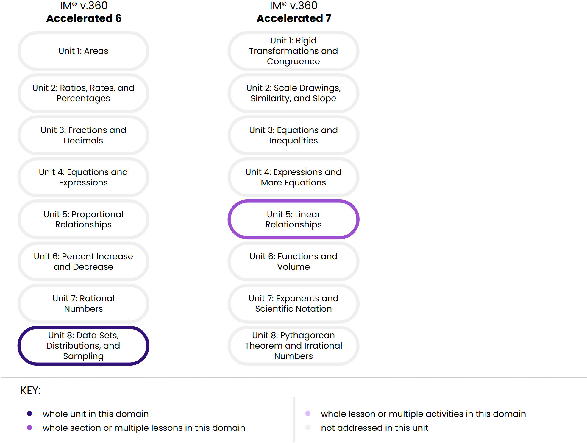 The Big Ideas from Grade 7 that are marked as “n/a” here are covered in IM v.360 Accelerated 7.