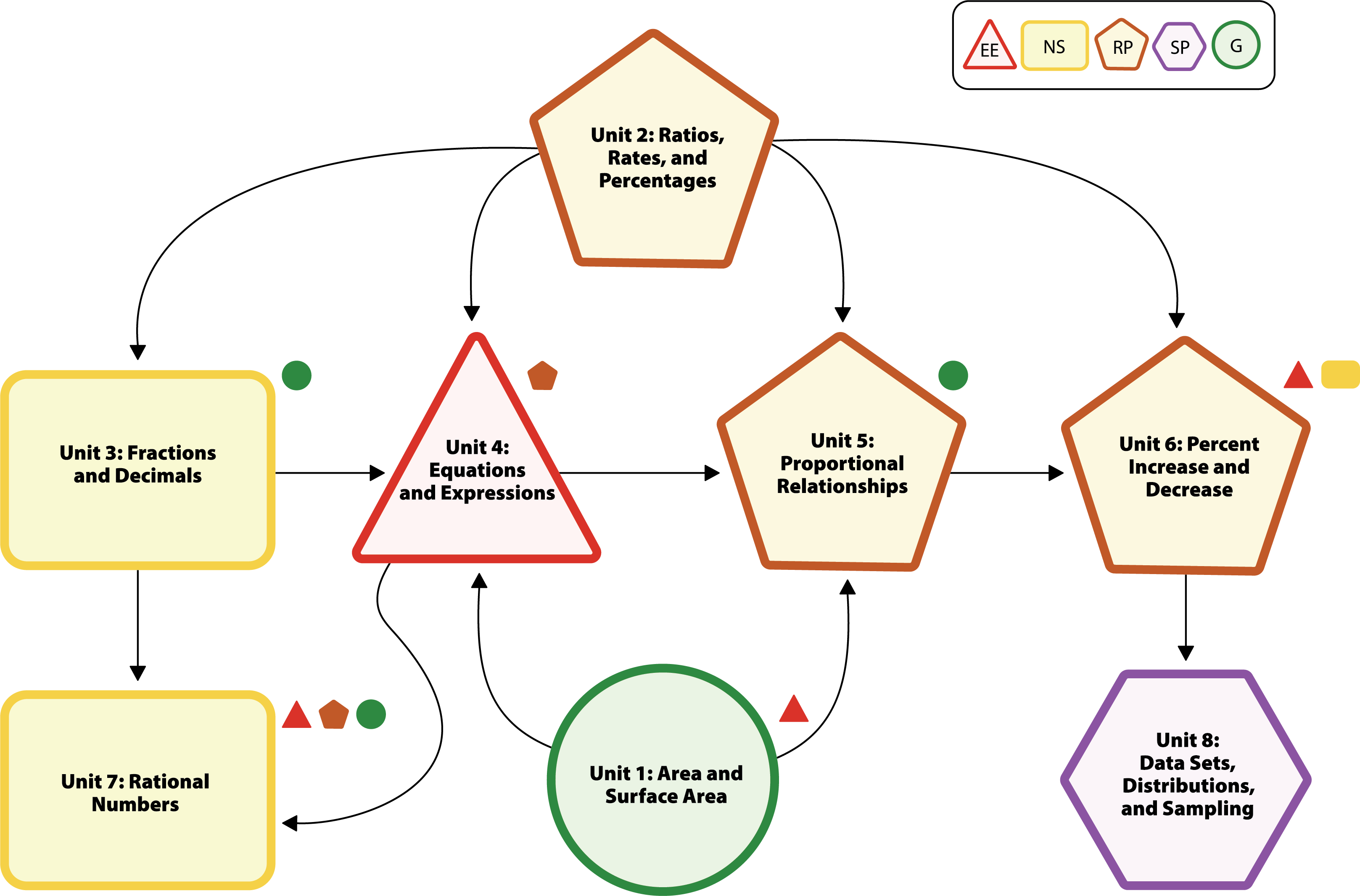 The diagram below links the major concepts in IM v.360 Accelerated 6 to the domains found in the California Common Core State Standards for Mathematics (CA CCSSM). Each shape represents a domain that is addressed within the major concept. The larger shapes represent the primary domain while the smaller shapes on the periphery represent secondary domains that are addressed. The arrows demonstrate how the major concepts are interconnected and build on each other.