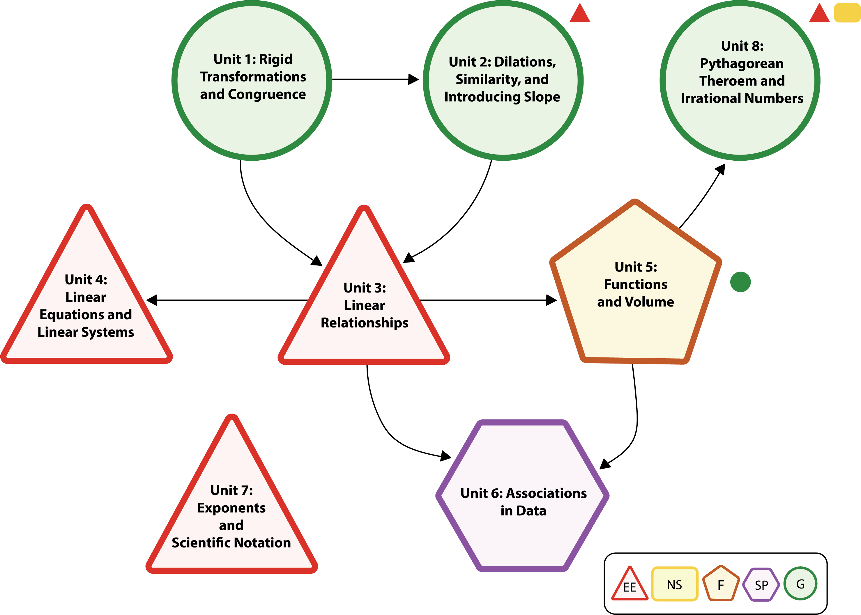 In the unit dependency chart, an arrow indicates that a particular unit is designed for students who already know the material in a previous unit. Reversing the order of the units would have a negative effect on mathematical or pedagogical coherence. Examples: