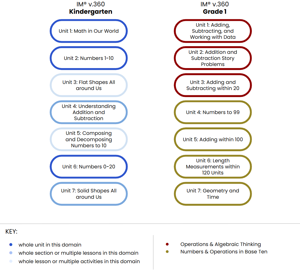 K: The CC domain is present in every unit within the Kindergarten course and prepares students for the work they will do throughout Grade 1. These skills are essential for students to grasp concepts that emphasize the NBT and OA domains, such as adding and subtracting within 20 and the understanding of numbers to 99. Here, we’ve highlighted the domain of each unit in IM v.360 Grade 1 that is most affected by the Counting and Cardinality work of Kindergarten.