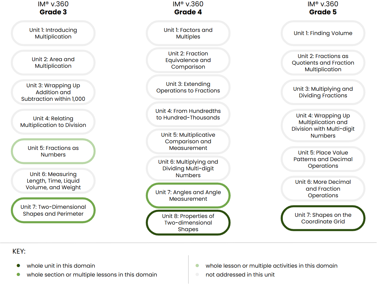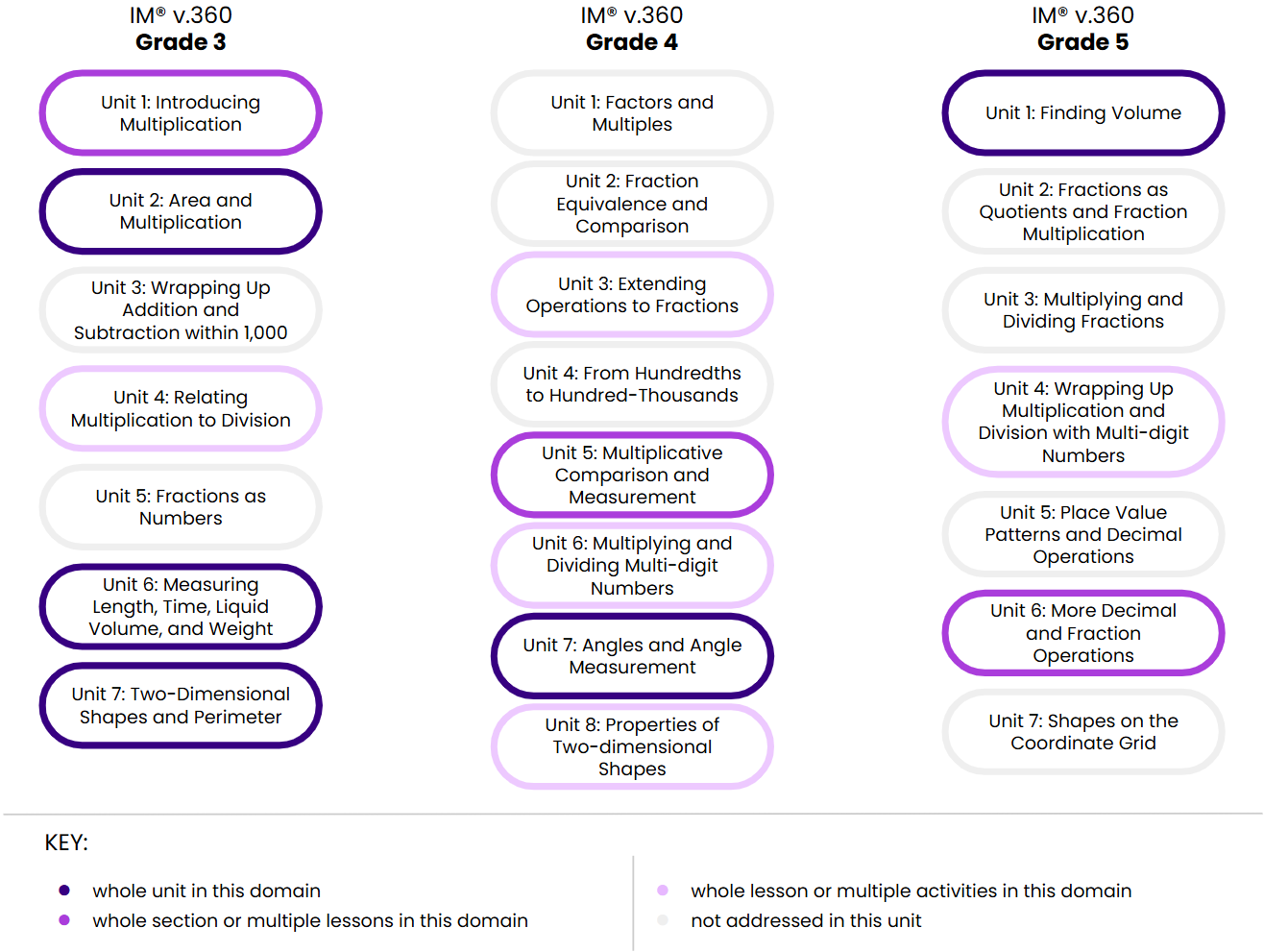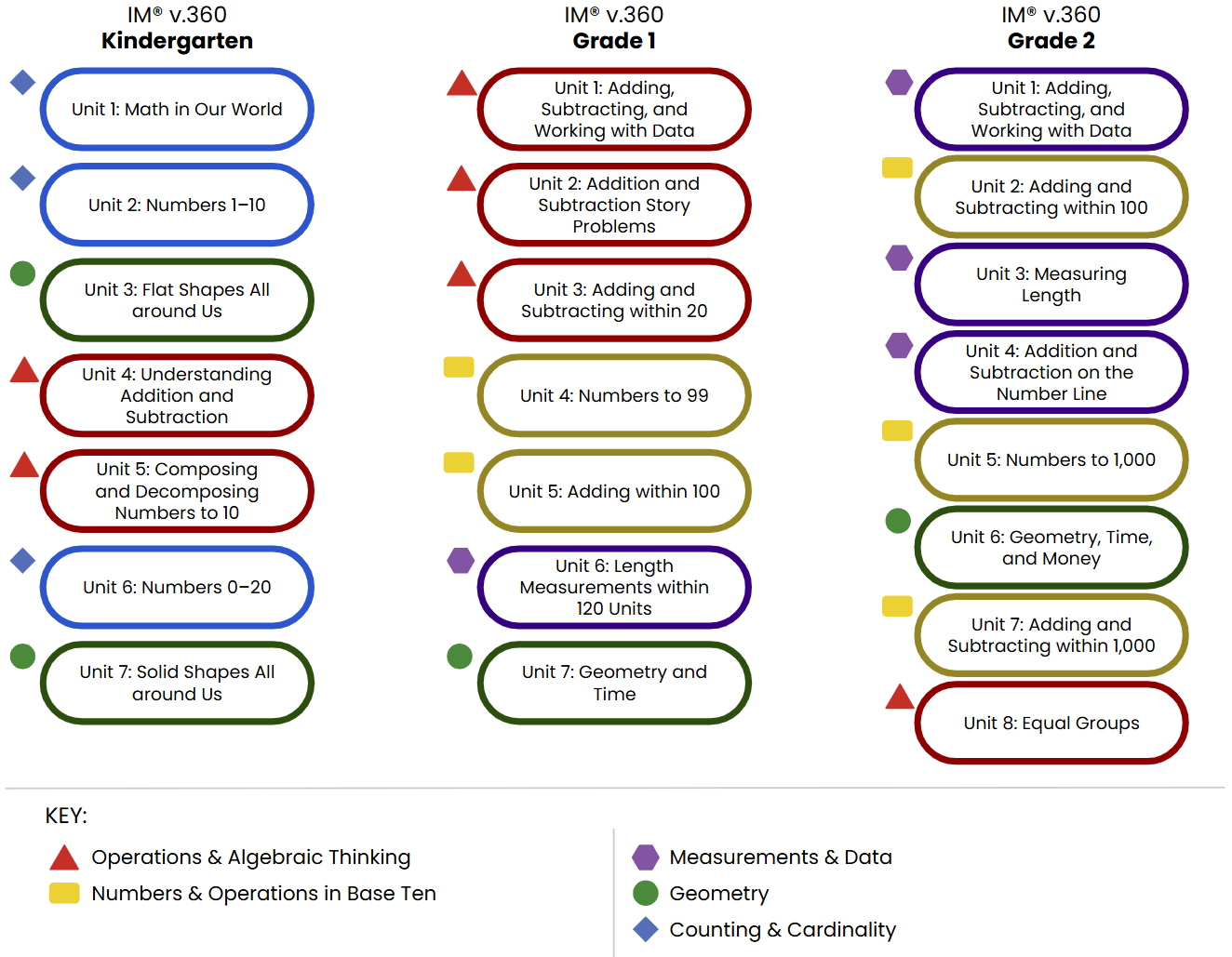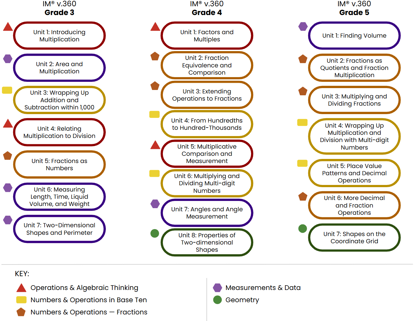 IM v.360 organizes each grade level into eight or nine units that each address a major concept and a group of related standards. The unit titles communicate the major concepts that are covered in each grade level.