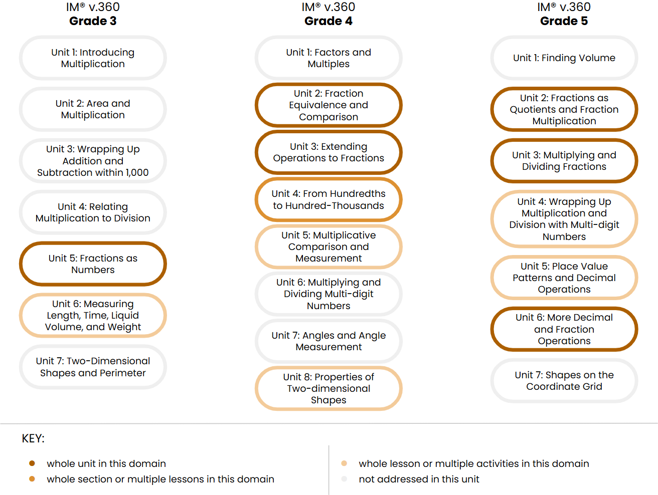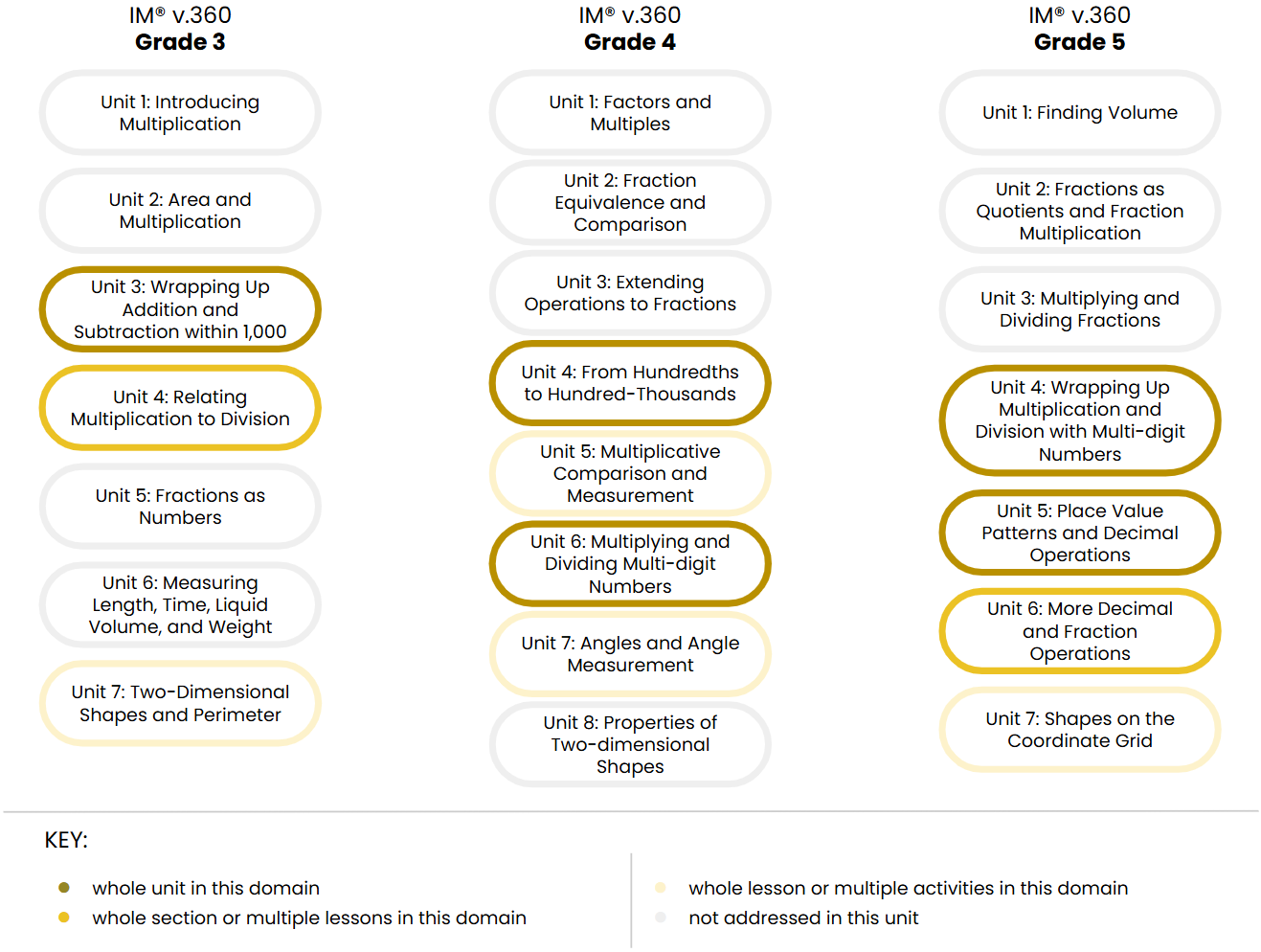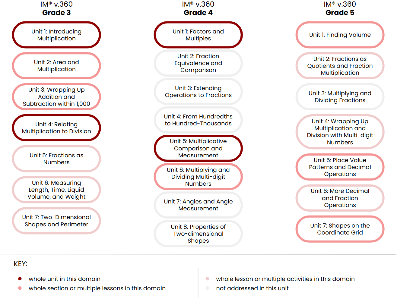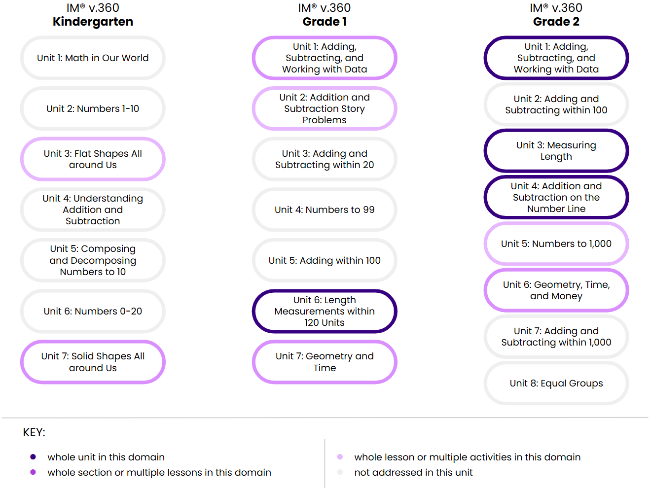 IM v.360 organizes each grade level into eight or nine units that each address a major concept and a group of related standards. The unit titles communicate the major concepts that are covered in each grade level.