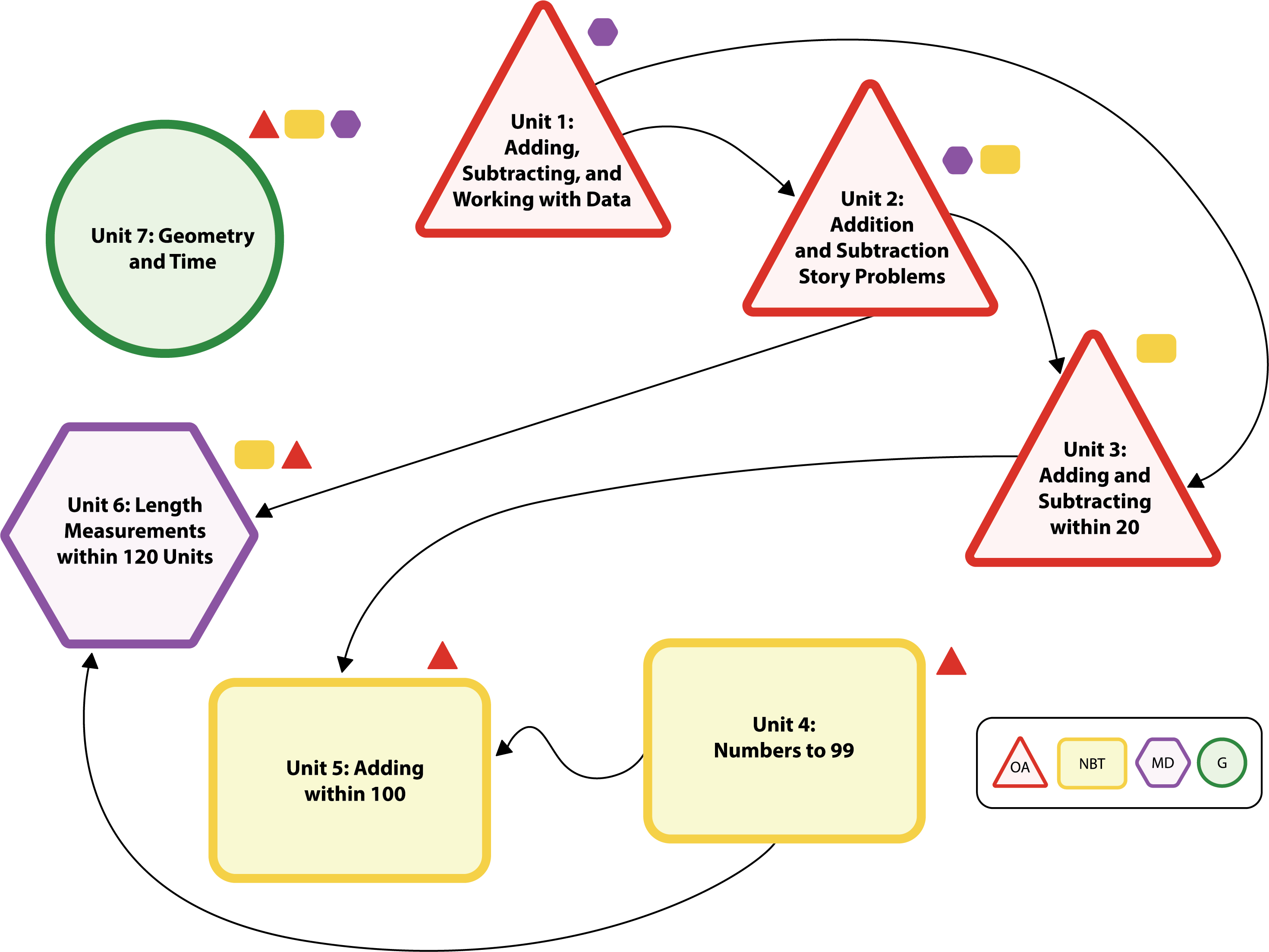 K–2: In Kindergarten, students begin exploring the OA domain through addition and subtraction in Unit 4, which supports their understanding of composing and decomposing numbers up to 10 in Unit 5. In Grade 1, students build on their understanding by adding and subtracting within 20. Finally, in Grade 2, students explore adding and subtracting within 100. The grade band culminates with students applying their understanding of this domain in Grade 2 Unit 8.