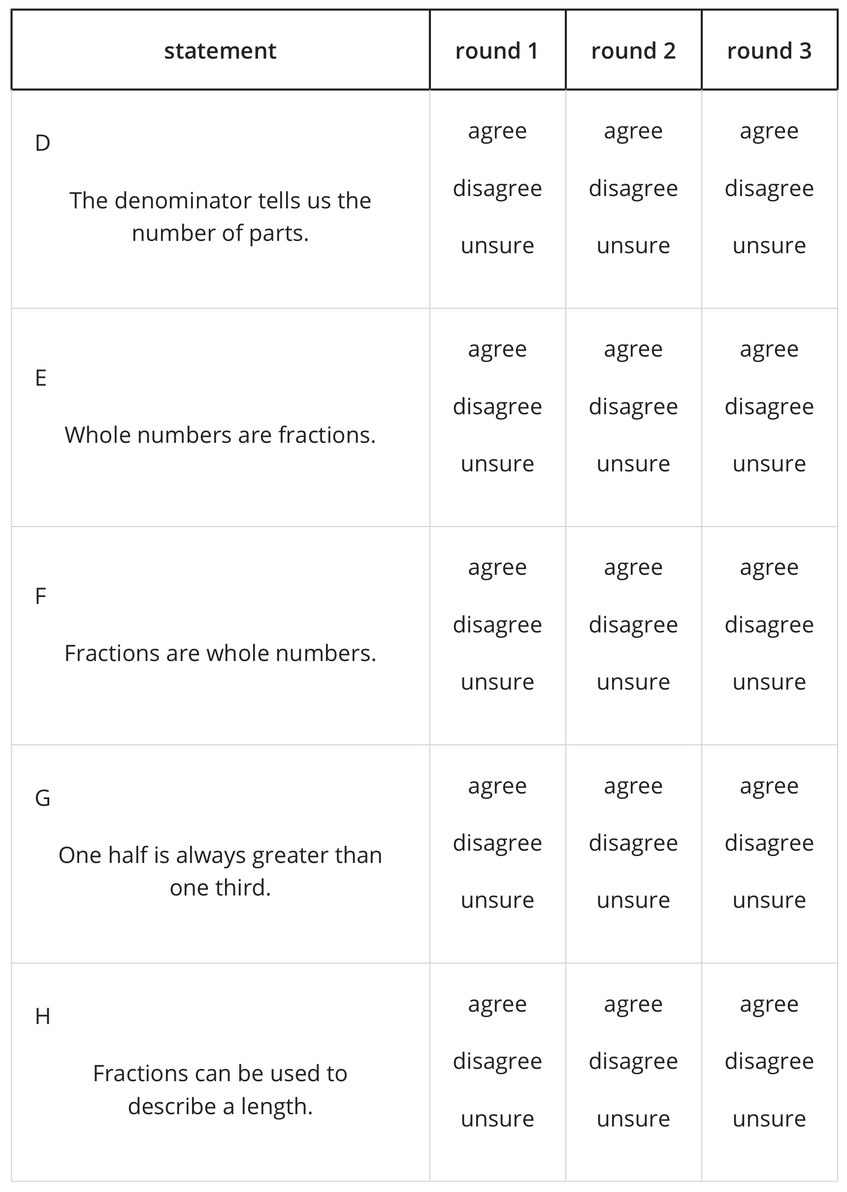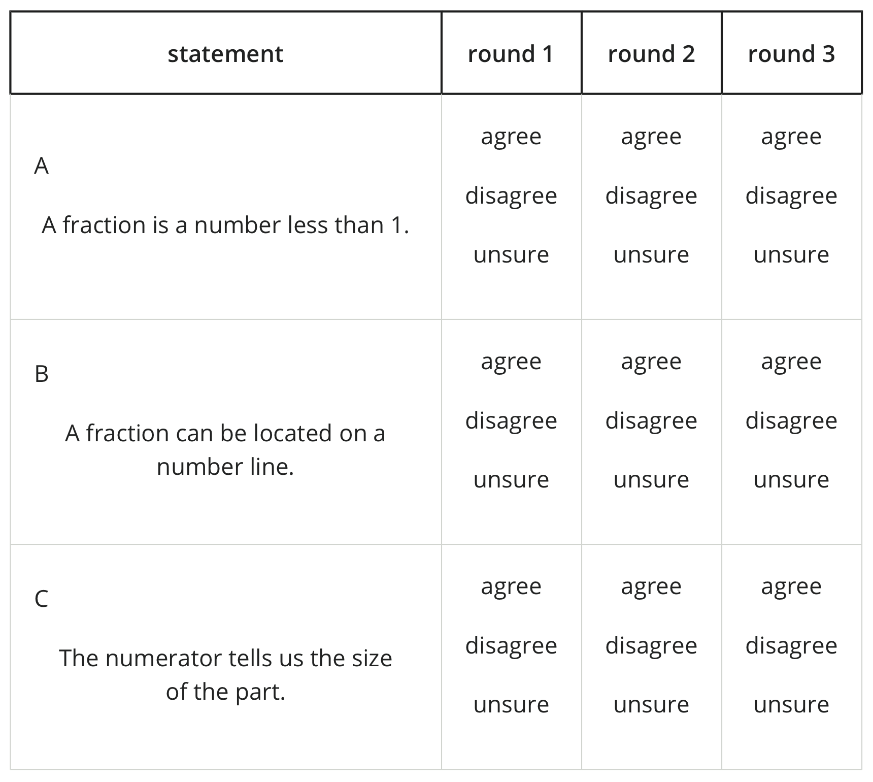 Round 2: Go around the group and state whether you agree, disagree, or are unsure about the statement you or someone else made in the first round. You can change your response in the next round.