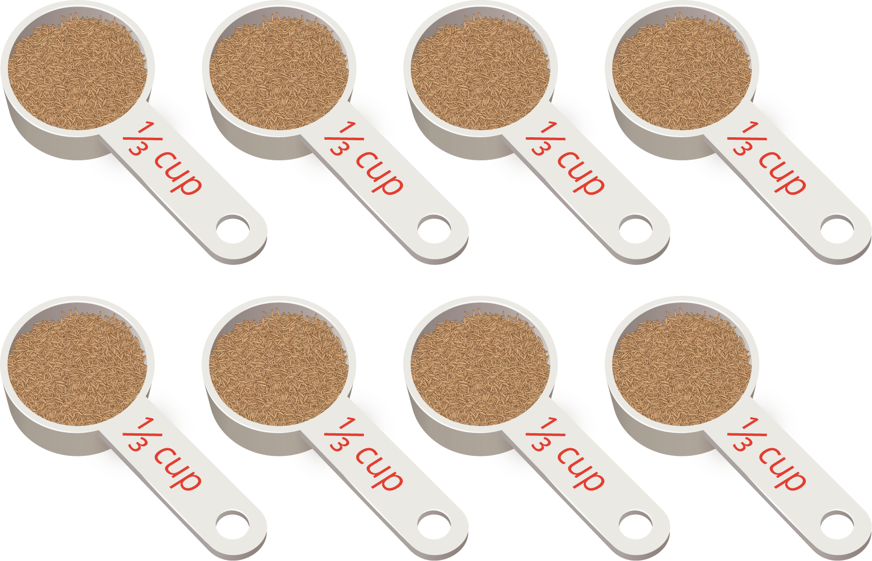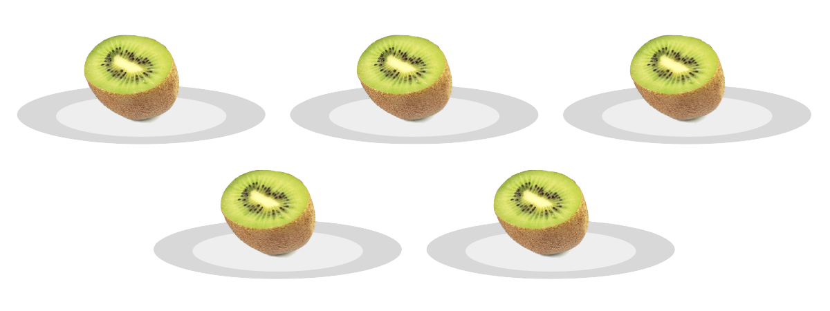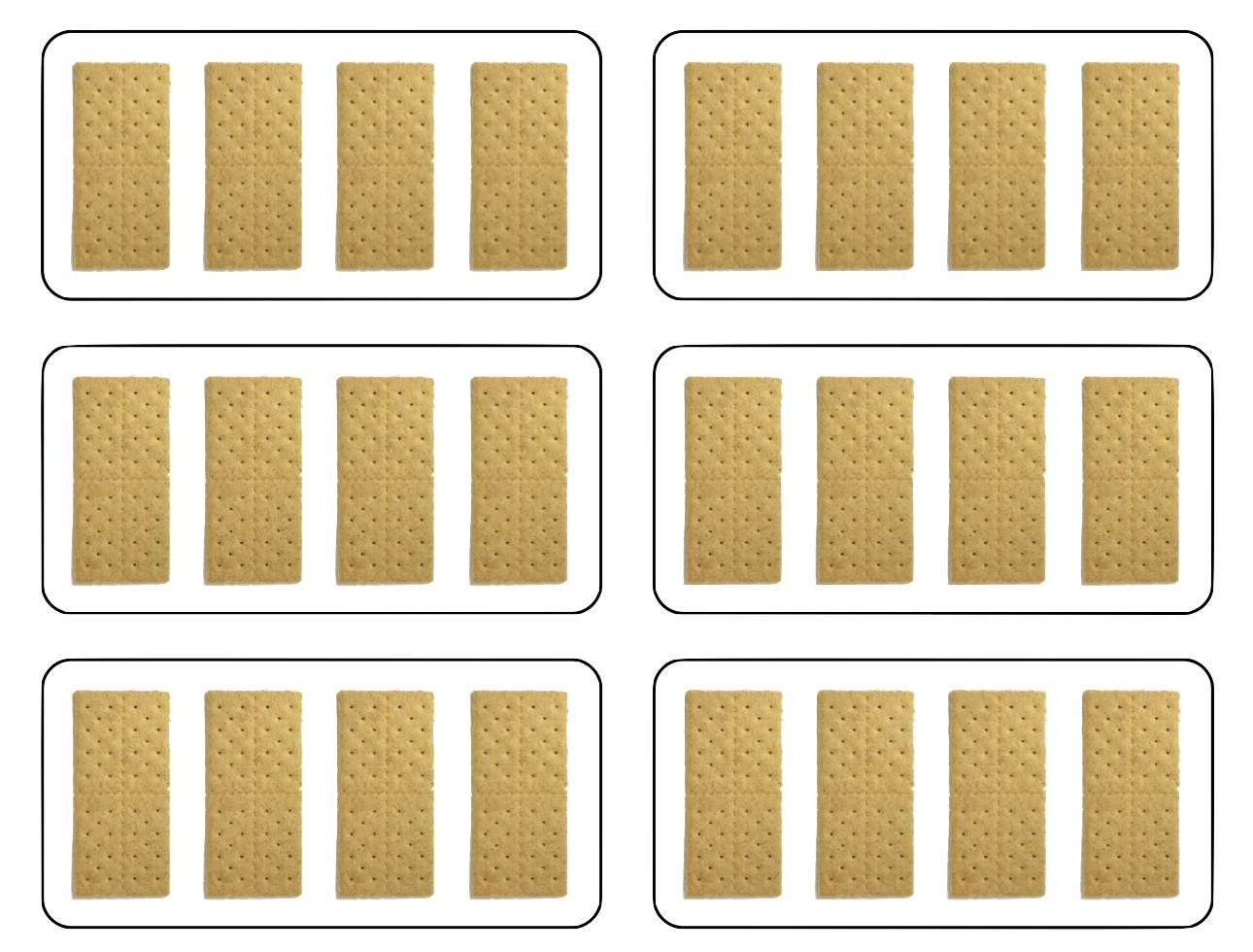 Here are more images and descriptions of food items. For each question, write a multiplication expression to represent the quantity. Then answer the question.